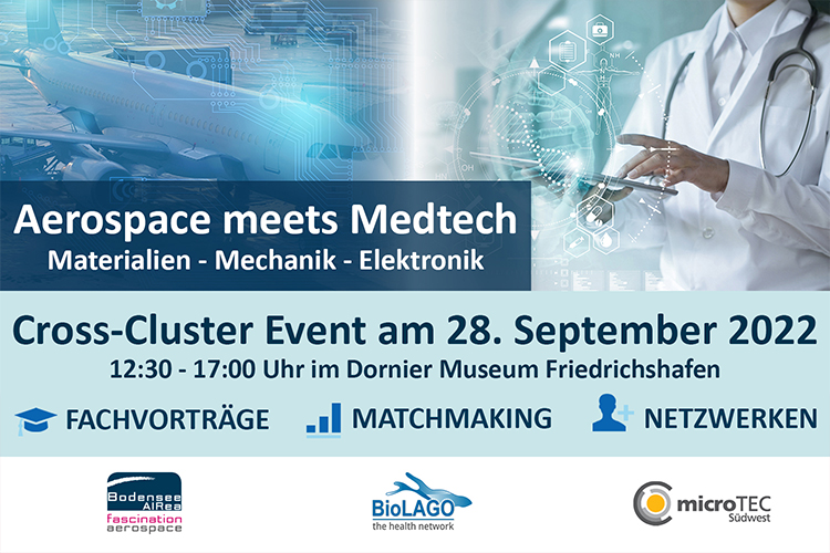 Unter dem Motto „Aerospace meets Medtech“ lädt das Luft- und Raumfahrtcluster BodenseeAIRea in Kooperation mit dem Gesundheitsnetzwerk BioLAGO und dem Mikrosystemtechnik-Cluster microTEC Südwest zum Cross-Cluster Event im Dornier Museum Friedrichshafen am 28.09.2022 ein. Die Teilnehmer erwartet ein spannendes Branchentreffen mit Experten der Gesundheitsbranche und Vertretern aus Luft- und Raumfahrt.