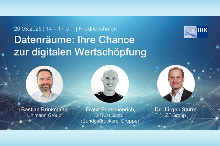 Die Experten Dr. Jürgen Sturm (ZF Friedrichshafen), Franz Fries-Henrich (d-trust GmbH, Berlin) und Bastian Brinkmann (Uhlmann Group, Laupheim) zeigen Ihnen am 20. März 2025 (Agenda), wie Sie durch sicheren Datenaustausch und standardisierte Datennutzung Ihre Wettbewerbsfähigkeit steigern, neue Geschäftsmodelle entwickeln und die Kontrolle über Ihre wertvollen Informationen behalten.